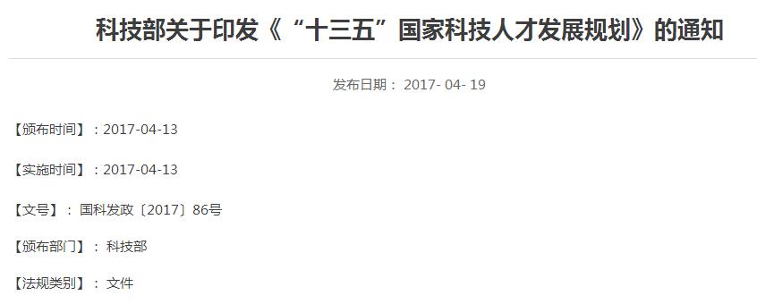 十三五”国家科技人才发展规划